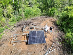 Afin de dénaturer le moins possible ce village, les panneaux ont été installés en haut de la colline, dans un champ. Les batteries, onduleur, etc ont été installés dans un local technique construit en 2 jours par les indiens Embera.
