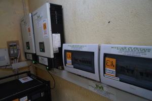 Bien que l’école soit connectée au réseau local (ESCOM), des coupures de courant persistantes ont conduit à l’installation de 22 panneaux photovoltaïques et de 4 batteries au lithium en guise de secours. Les panneaux ont été placés sur le toit du bâtiment scolaire, un local technique restauré abrite désormais l’équipement de régulation solaire, les boîtiers électriques et les batteries. Le système solaire (près de 10kWp avec une capacité de stockage de 19,2kWh) assure une alimentation électrique continue dans les salles de classe, la salle informatique et dans le bloc administratif pendant les pannes.