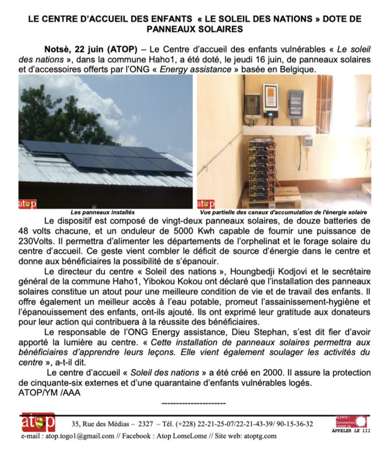 Nos bénévoles ont été chaleureusement remercié par les autorités locales et le résultat de ce projet a été largement relayé par les télévisions et radios locales ainsi que par l’agence togolaise de presse, ATOP , dont vous trouverez l’article ci-dessous :